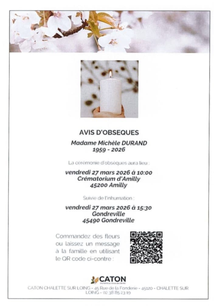 La cérémonie d'obsèques aura lieu le vendredi 27 mars, à 10 h au crématorium d'Amilly, suivie de son inhumation à 15h30 au cimetière de Gondreville.